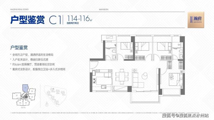 114-116㎡4房2厅2卫01(C1)户型,设计的是横厅朝东南向,客餐厅开间6.6米,LDKB一体化设计,四开间朝南,全屋7面飘窗,主卧套房+步入式衣帽间,3个次卧朝西北向。