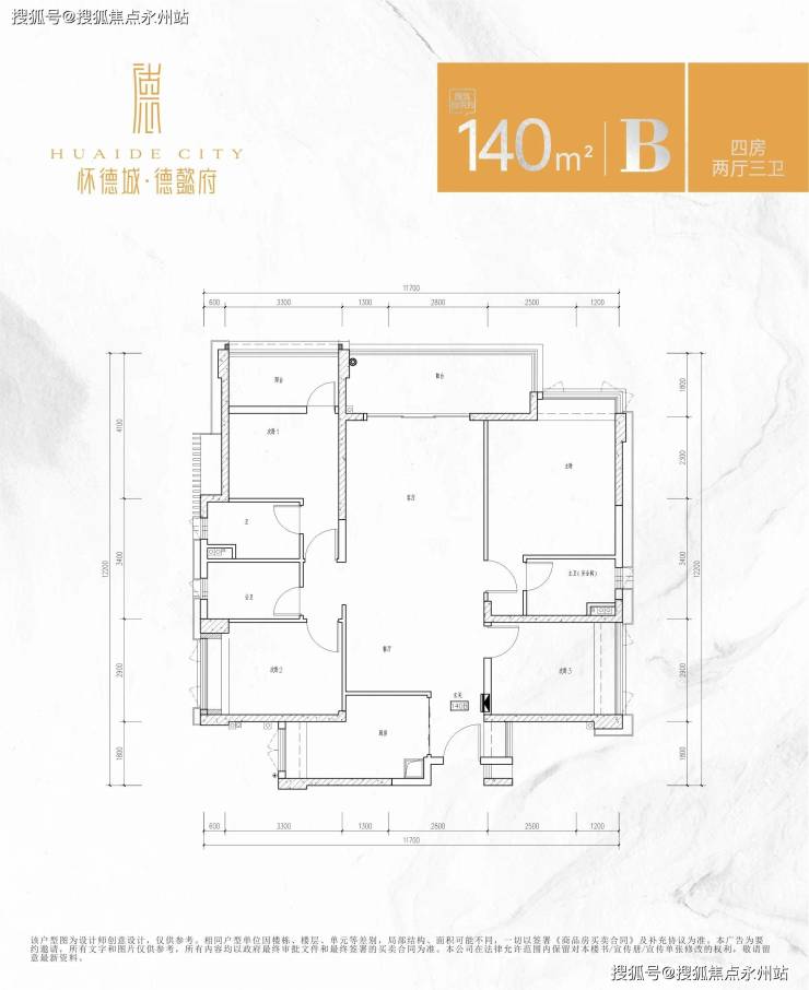 140㎡4房2厅3卫:户型东北朝向和东南朝向设计,几乎全飘窗+大双阳台设计,赠送拉满,客厅4.1米开间,双主卧套房设计,其中一个套房以阳台报建了部分面积,卧室分别做到了3.7米/3.3米/2.9米/2.9米的宽度,L型厨房,卫生间干湿分离设计,共2.5开间双阳台设计,要是三个卫生间也做飘窗,那赠送面积就拉满了。卧室、厨房和卫生间尺寸都能做到比较舒适,空间利用效率较高,整体户型设计没啥毛病。