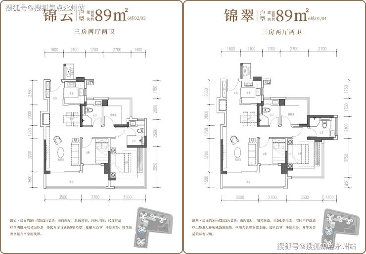 建面约88-89㎡3房2厅2卫:采用竖厅设计,全南朝向,采光通风俱佳。作为刚需首选户型,该户型格局方正,动静分区合理,双卫配置满足多人口家庭使用需求,全屋飘窗设计进一步拓展使用空间,得房率优势让实际居住感受媲美传统百平户型。