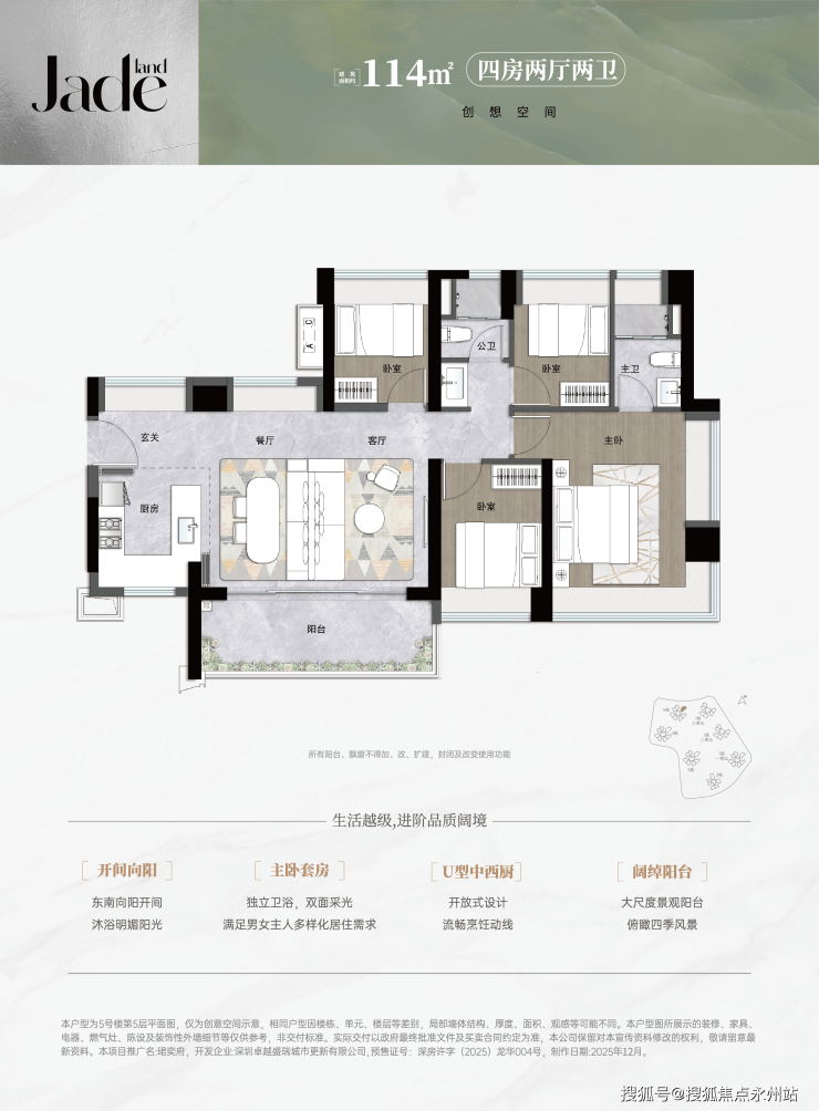 114㎡4房2厅2卫,横厅南北通透格局,LDKB一体化,五开间朝南,全屋9面飘窗,赠送后得房率约93%,阳台主朝东南向。