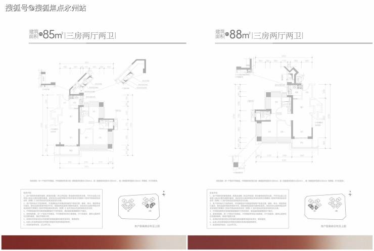 85㎡的3房2厅2卫:设计的经典竖厅格局,客厅3.4米开间,LDKB一体化设计,S墙设计预留冰箱卡槽位,3个卧室分别做到了3.55米/2.6米/2.4米的宽度,U型厨房,公卫三段式分离设计,得房率约:95%(包含赠送),阳台进深1.8米,有西南或东南朝向。