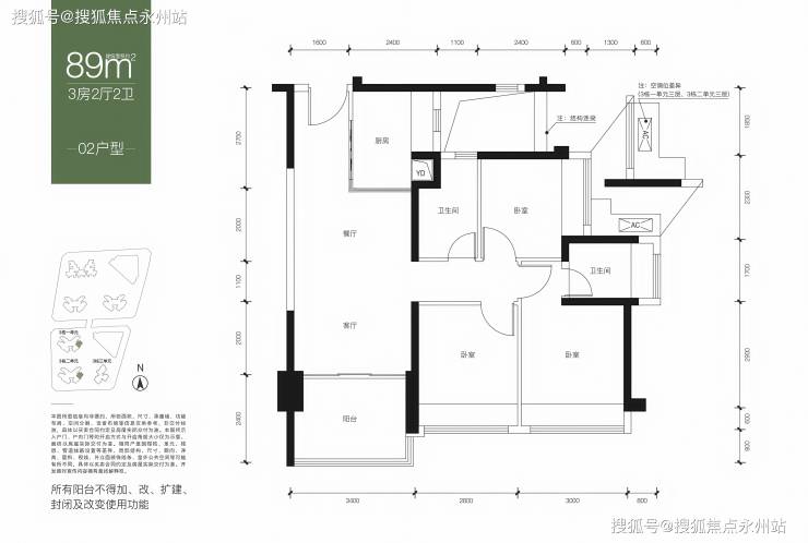 90㎡3房2卫:位于18层小高层02户型,两梯三户。