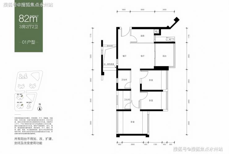 82㎡的3房2厅2卫户型设计的是竖厅南北通透格局,客厅3.3米开间,3个卧室分别是3米/2.6米/2.4米的宽度,主卧南北通透设计,L型厨房。