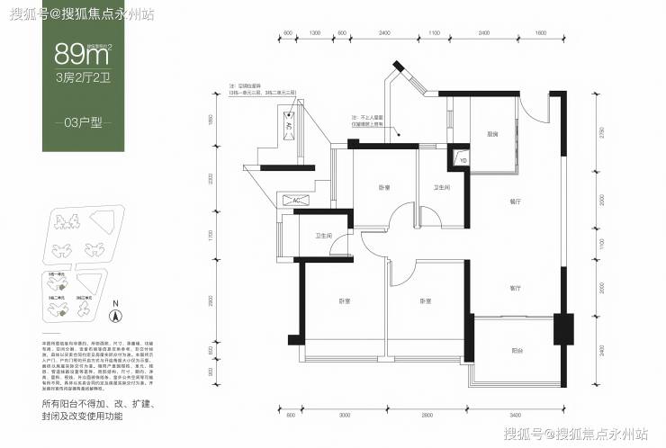 89㎡的3房2厅2卫户型设计的是经典竖厅格局,客厅3.4米开间,三开间朝南,3个卧室分别是3米/2.8米/2.4米的宽度,L型厨房,