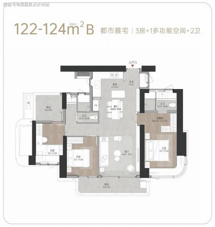 122-124㎡(B户型)3+1房2卫:空间布局合理实用,采光通风俱佳LDKB一体化,动线流畅,尺度约5.5m进深大主卧套间,面宽约6.2m双开间大阳台,可开可合式厨房设计,明亮多功能+1空间灵活多变。