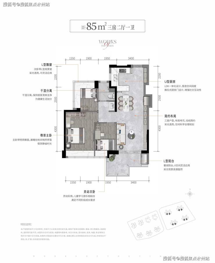 约85㎡三房一卫(3/4栋05/06户型)竖厅格局,餐客一体,客厅开间约3.4米,卫生间三段式分离设计,L型阳台,有东南、西南朝向。