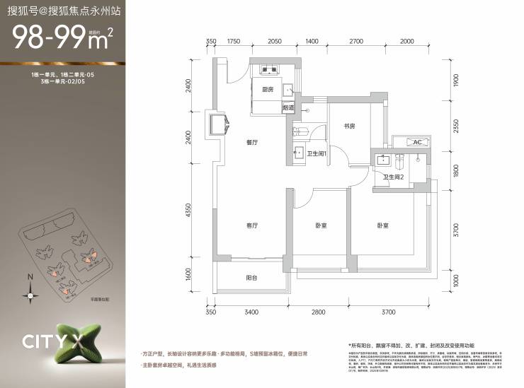 98㎡三房两厅两卫是项目的主力户型,分为西南向和东南向两种。该户型采用"四叶草"动静分区设计,客厅开间3.4-3.6米,主卧14.3㎡(含270°飘窗),得房率约85.65-86.96%。西南向房源折后总价378-387万,东南向房源389-404万,东南向房源因采光更好,价格高出约10-15万。