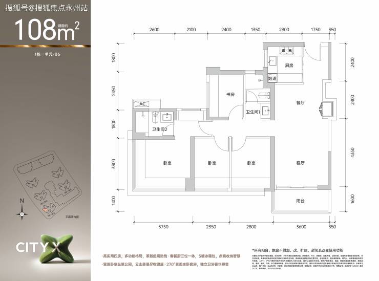 108㎡四房两厅两卫定位为改善型产品,采用四开间朝南设计,客厅3.6米开间,LDKB 一体化设计,主卧16.2㎡(含衣帽间),得房率约87.28%(含赠送)。该户型折后单价4.37-4.52万/㎡,总价475-491万,是目前项目库存较多的户型之一。