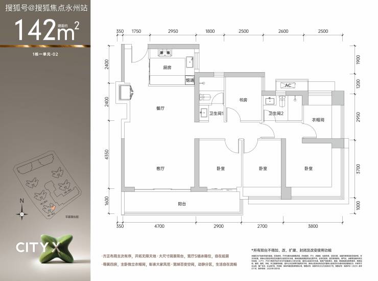 142㎡四房两厅两卫是项目的终极改善产品,仅52套,占比不足4%。该户型客厅4.7米开间,主卧24.03㎡(含衣帽间),赠送12.16㎡观景阳台,实得面积121.81㎡。11月加推的1栋1单元中,该户型折后总价624-648万,东南向直面社区中央园林,预计租金回报率3.5%,高于区域平均水平。