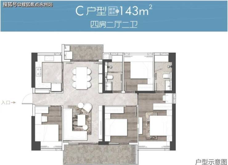 户型:109-111㎡3房,121-143㎡4房