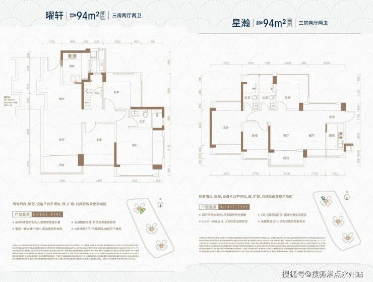 约94㎡三房两卫:提供竖厅/横厅双选择,横厅版本客餐厅开间5.7米,南北通透,全屋配备10个飘窗,空间利用率拉满。