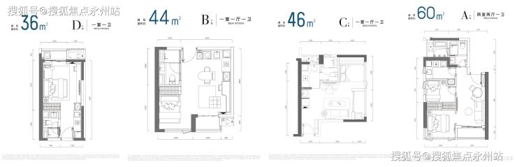 公寓:36-60㎡一至两房(总价200万起),精装交付,通燃气,单价为住宅的6-7折(6-8万/㎡)。