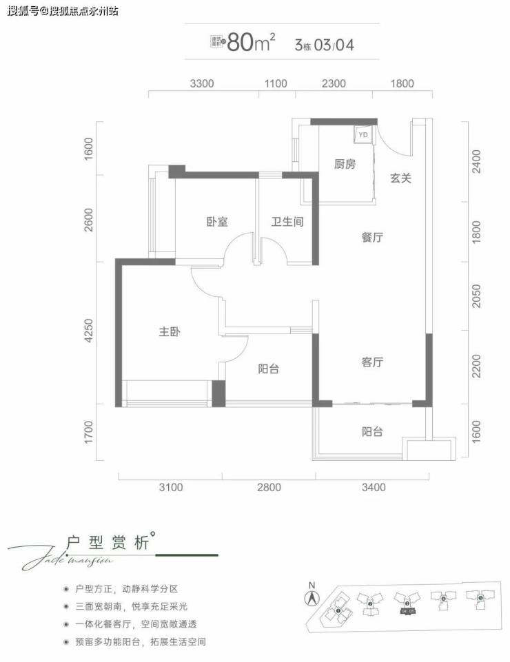 80平2+1房1卫:最小面积户型,南朝向,传统的竖厅户型动静分区格局,餐客厅18.72㎡,客厅开间3.4米,整个动区的观感应该还蛮阔绰。其中的阳台和过道需要改造成房间;主卧大小为10平米,空间算比较大,两个次卧比较平均,没有特别小的卧室,不足的地方是只有一个卫生间,客厅没有设计S墙,冰箱真不好放。厨房只有3.68平米左右,操作空间有点小整体使用率在78%左右,是南山门槛较低的上车户型。