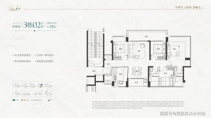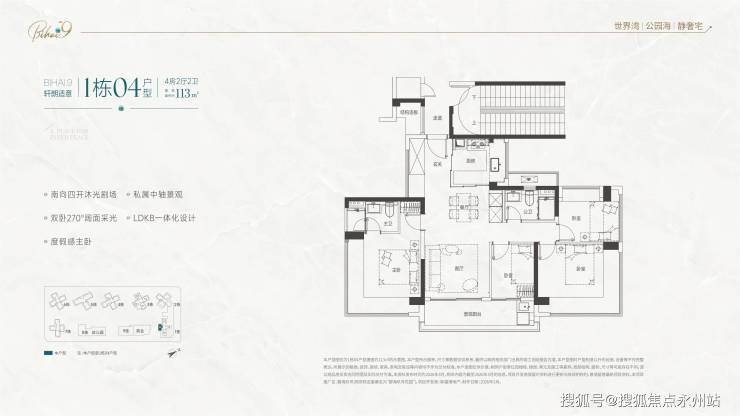 112㎡-113四房两厅两卫(B1/B2/B3 户型)提供三种格局:竖厅、横厅、双龙抱珠设计,适配不同家庭偏好,LDKB 一体化设计,空间利用率高,阳台长约 6-8 米,主卧套房设计,独立卫浴 + 衣帽间,私密性强,南北通透,多开间朝南,部分户型可享海景与碧海湾高尔夫景观。