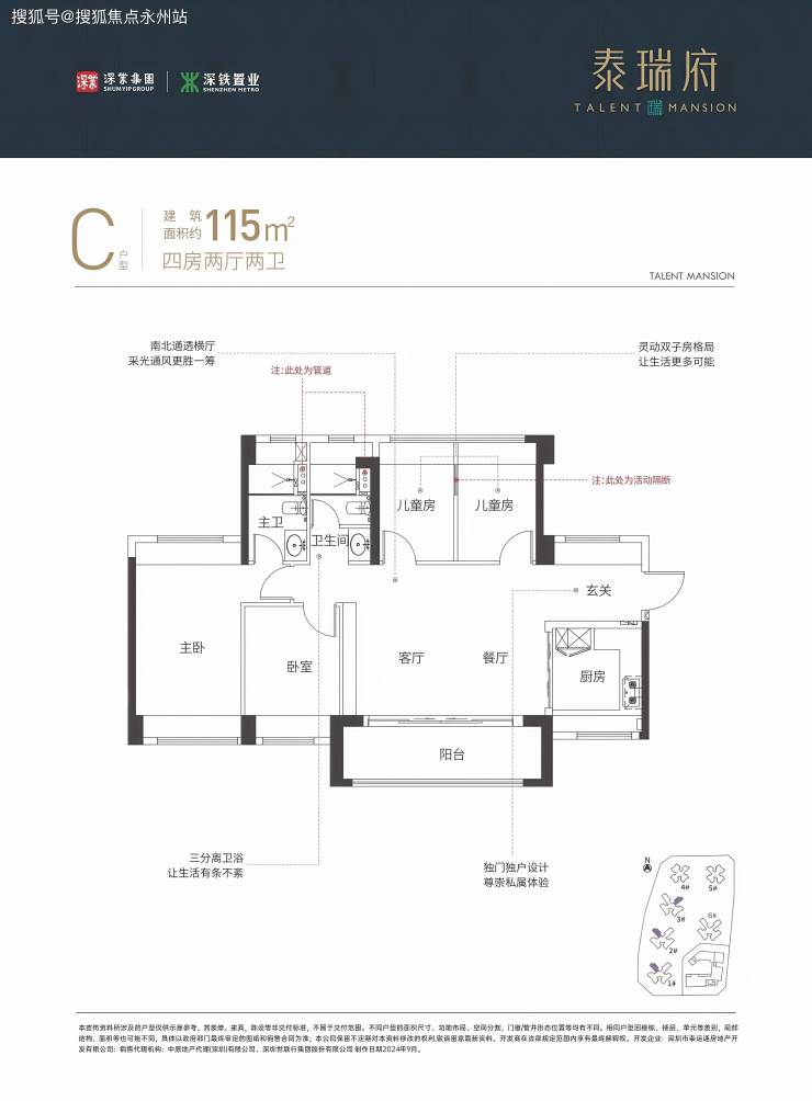 建面约115㎡4房2厅2卫(西南/东南朝向):客餐厅开间5.85米,四开间朝南,主卧南北通透带飘窗,公卫三段式分离。北向次卧可打通为书房或家庭活动室,满足多人口家庭需求,阳台主朝西南,中高楼层可俯瞰大运枢纽全景,对比前期楼栋优惠约14-19万。