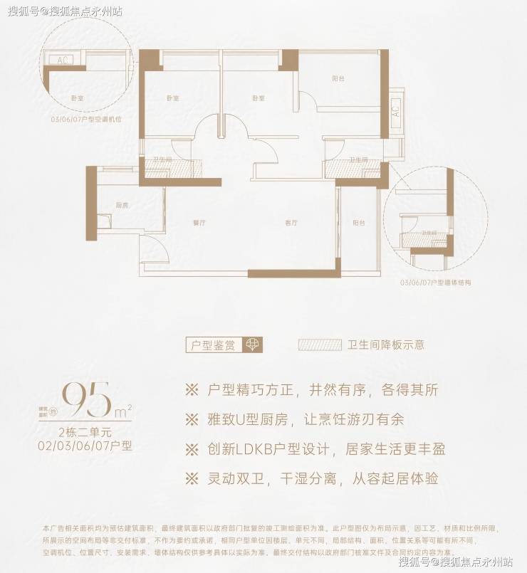95㎡3房2厅2卫:竖厅格局,创新LDKB一体化设计,L型厨房,干湿分离卫生间,东南或西北朝向阳台,得房率约73%(不含赠送)。