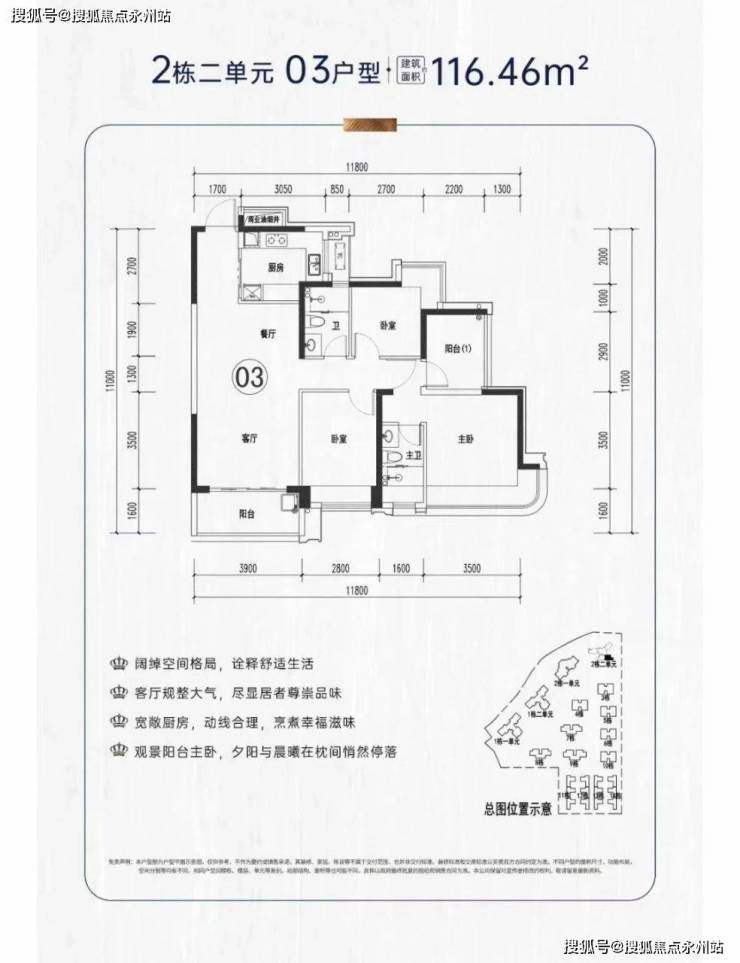【2栋2单元01户型】116㎡做南北通四房户型使用率挺不错,客厅开间3.8米,阳台赠送面积,主卧还配置了L型飘窗,整体设计跟之前的121㎡户型差不多。