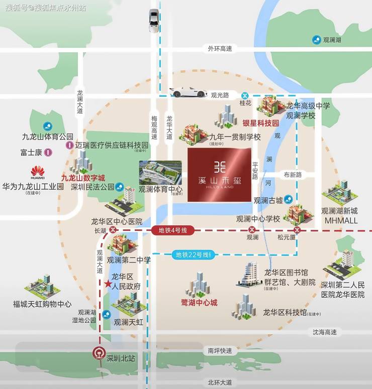 项目位于龙华区观澜街道,属于深圳都市核心圈之上的“龙华区府行政中心”,占据龙华“一圈一区三廊”发展格局的关键位置,周边环绕九龙山数字城、鹭湖中心城、观澜文化小镇三大重点片区,聚焦人工智能、生物医疗等高新技术产业,已聚集华为、富士康、华润等1700多家企业,总产值超5000亿,产业集聚带来大量高端人才流入,预计未来人口红利将持续推动住房需求。