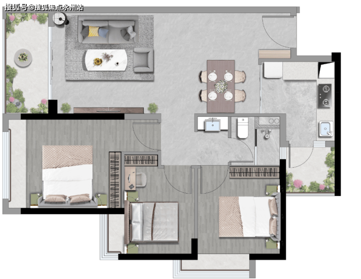 「88㎡的3房2厅1卫」设计的是竖厅格局,客厅3.5米开间,3个卧室分别做到了主卧13.2㎡/次卧9.5㎡/次卧8.1㎡(包含墙体飘窗),厨房还带1个小生活阳台,得房率约80%(不含赠送),西南朝向。