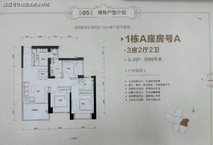 89㎡的3房2厅2卫,设计的是经典竖厅格局,客厅3.29米开间,3个卧室分别是3.3/2.8/2.5米的宽度,L型厨房,带1个小生活阳台,得房率约:76%(不含赠送),西南、东南及东北朝向。