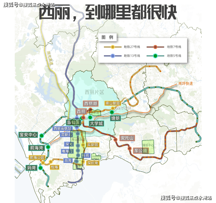 西丽综合交通枢纽(规划中) ——汇集4高铁(赣深客专、深茂铁路、深汕高铁、深珠高铁)、2城际(深惠、深莞增城际铁路)、4地铁【地铁13号线(在建中)、15/27/29号线(规划中)】的湾区枢纽。