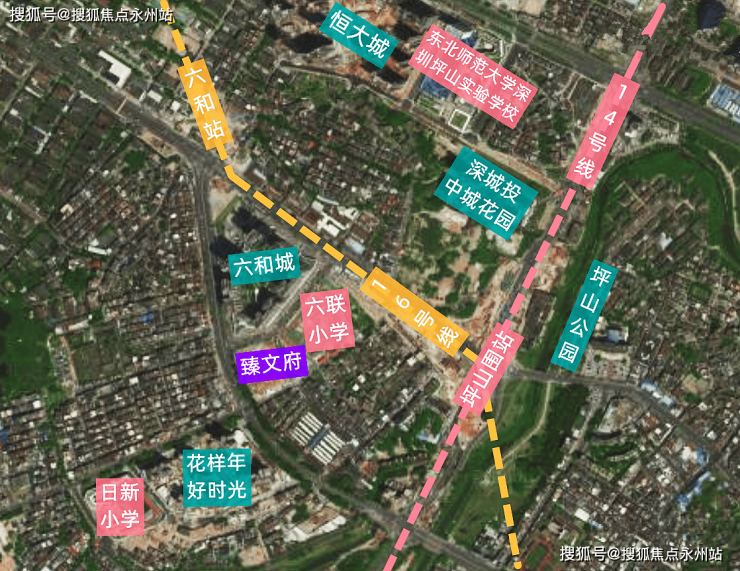 项目位于坪山中心区六和城旁边,东纵路与迎春路交汇处,项目北侧紧挨着一期六和城,东侧是六联小学,南侧是坪山综合批发市场,西南侧是花样年好时光,目前项目周边有大片城中村,不过基本都已经纳入城市更新范围,面貌日新月异。14/16号地铁线“坪山围站”F出口距离约270米。