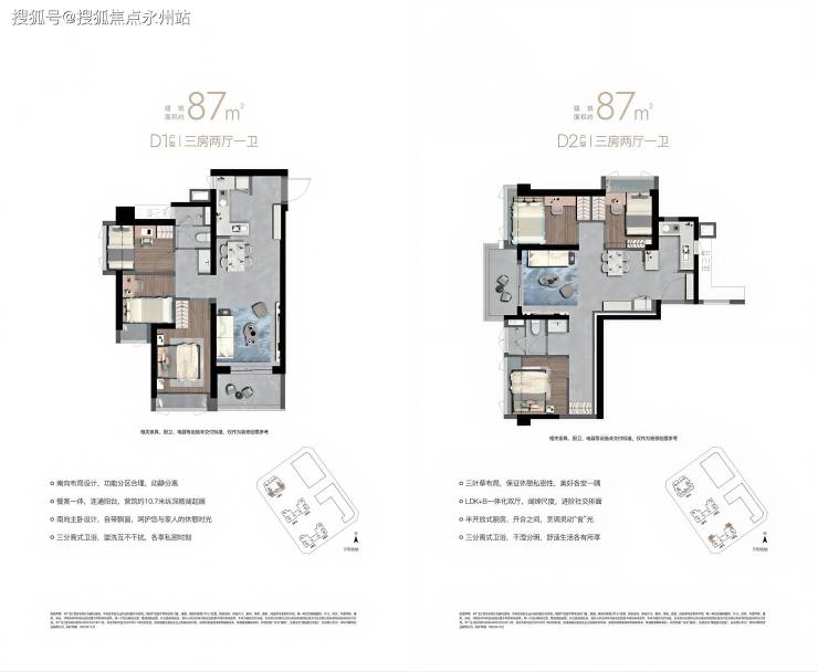 87㎡三房两厅一卫:“10.7 m纵深紧凑南向三房”,10.7 m纵深餐客一体,通风采光极佳。