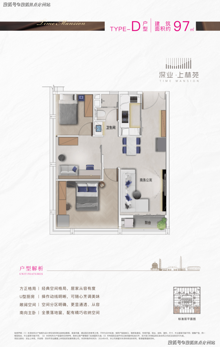 产品形态:主推40-97㎡精装商务公寓,主力户型为40-50㎡小户型(占比80%),另有少量20-36层改善型套房,涵盖1-3房全生命周期需求。