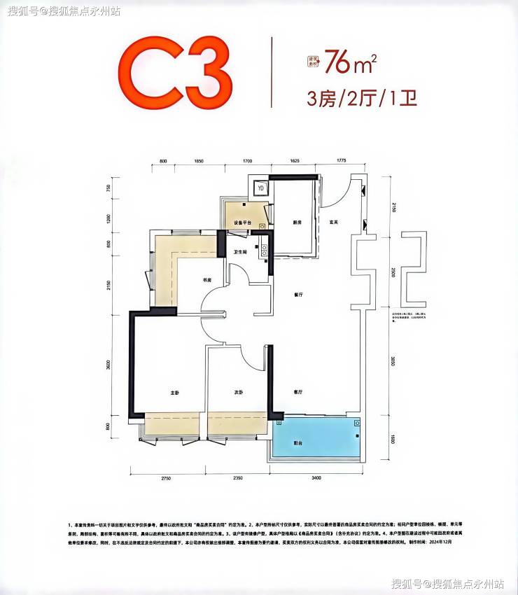 76㎡的3房2厅1卫,设计的是经典竖厅格局,客厅3.4米开间,LDKB一体化,S墙设计预留冰箱卡槽位,3个卧室分别做到了主卧10.99㎡/次卧7.3㎡/次卧5.91㎡(实测面积,去掉墙体),U型厨房,卫生间三段式分离,还带1个设备平台,赠送面积高达12.71㎡,实际得房率约97%(包含赠送),西南/东南或西北朝向。