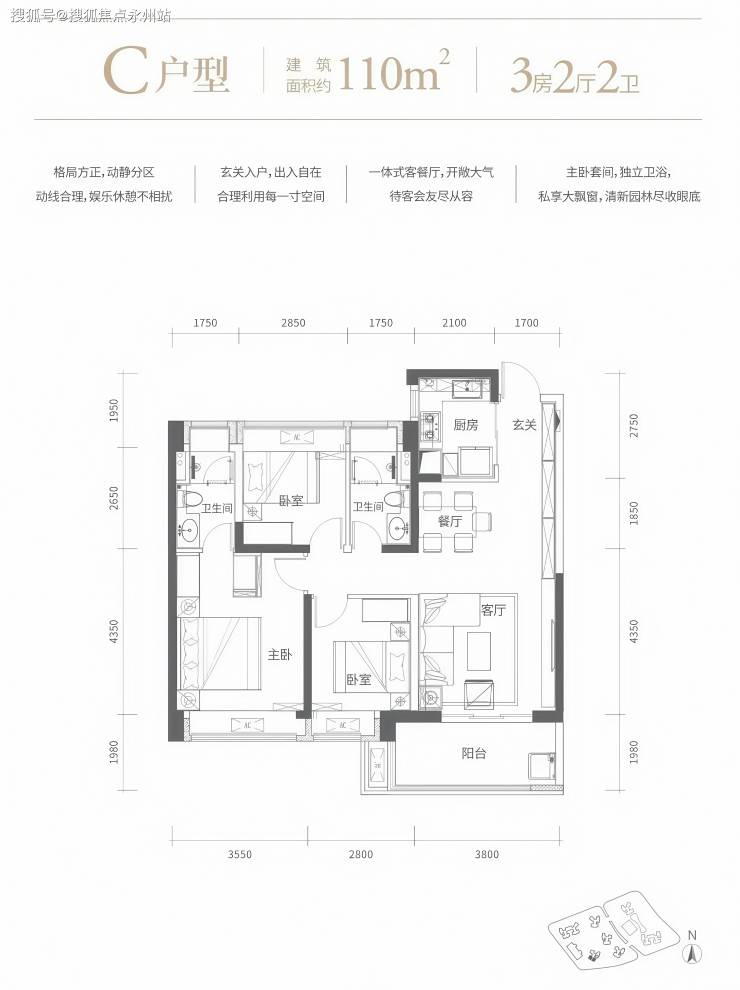 110㎡的3房2厅2卫,A2户型,设计的是经典竖厅格局,客厅3.8米开间,进门玄关,LDKB一体化设计,动静分区,三开间朝南,L型厨房,卫生间干湿分离,西南朝向。
