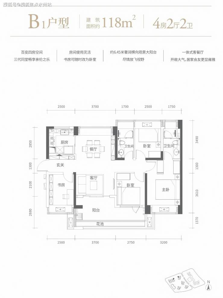 118㎡的4房2厅2卫,设计的是竖厅南北通透格局,客厅3.7米开间,进门玄关,四开间朝南,客厅连接次卧出6.45米长的大阳台,U型厨房,卫生间干湿分离,阳台主朝东南或西南向。