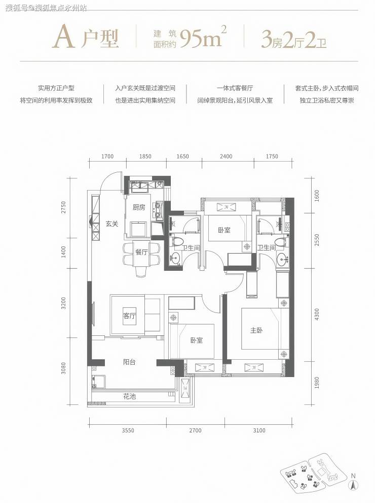 95㎡的3房2厅2卫,设计的是经典竖厅格局,客厅3.55米开间,进门玄关,LDKB一体化设计,动静分区,三开间朝南,L型厨房,卫生间干湿分离,东南、西南或正南朝向。