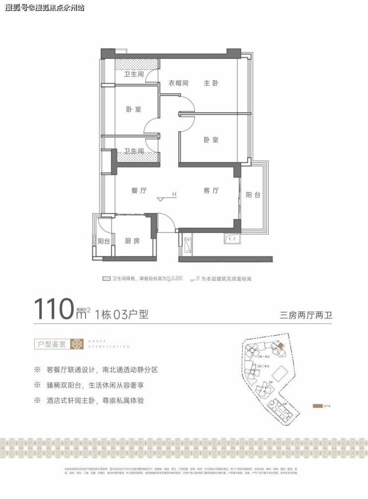 110㎡的3房2厅2卫:设计的是竖厅南北通透格局,三开间朝南,全屋飘窗设计,主卧大套间,U型厨房,还带1个小生活阳台,得房率约75%(不含赠送),客厅阳台主朝东南向。