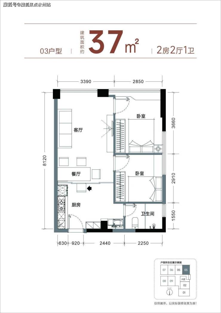 主力为37㎡两房,实际室内实用面积54-63㎡,实际使用率达145%-170%
