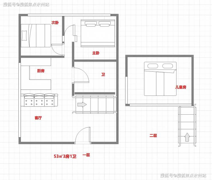 建面约53㎡三居室:层高3.6米,采用“竖厅+三卧”设计,主卧与次卧均配备飘窗,书房可灵活改造为儿童房或储物间。