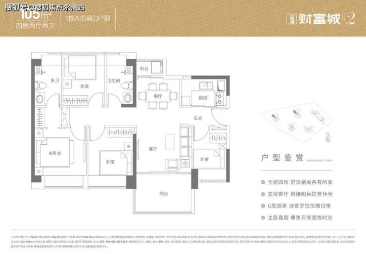 105㎡的4房2厅2卫:设计的是竖厅南北通透格局,客厅3.5米开间,全屋飘窗双阳台设计,4个卧室分别是3.25/2.85/2.6/2.1米的宽度,U型厨房,阳台主朝西南向。