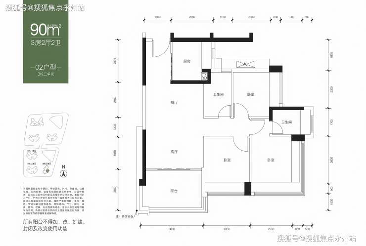 90㎡-3房2厅2卫,仅3栋2单元02户型,设计的是经典竖厅格局,客厅3.8米开间,三开间朝南,3个卧室分别是3.2米/2.95米/2.85米的宽度,L型厨房,得房率:75.97%(不含赠送),东南朝向。