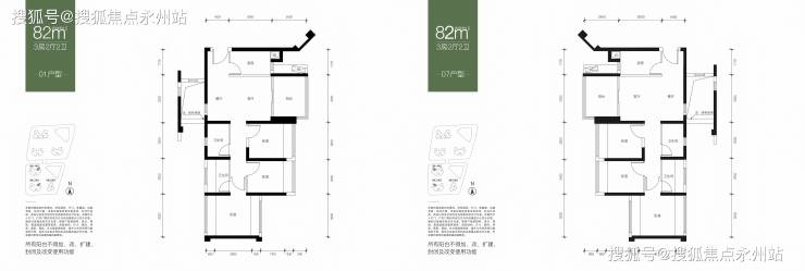 82㎡-3房2厅2卫,设计的是竖厅南北通透格局,客厅3.3米开间,3个卧室分别是3米/2.6米/2.4米的宽度,主卧南北通透设计,L型厨房,得房率:75.42%(不含赠送),01户型是西北朝向,07户型是东北朝向。