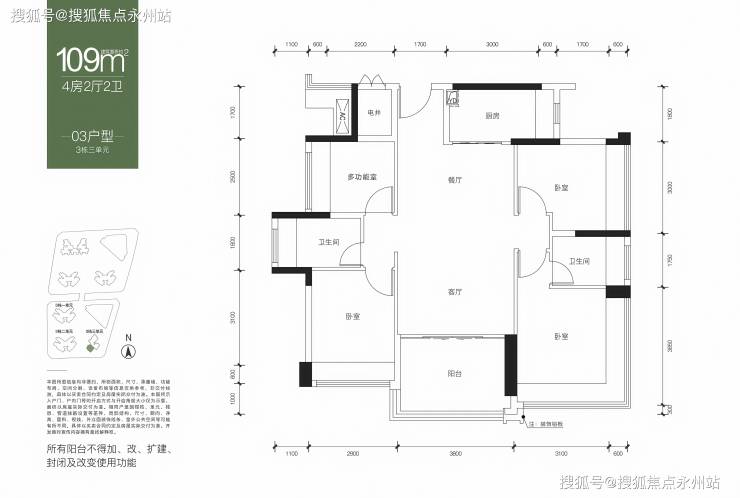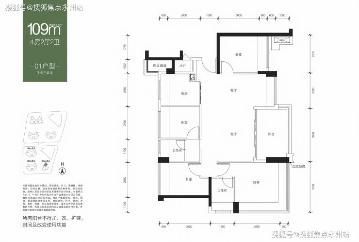 109㎡的4房2厅2卫,仅3栋3单元的01户型,设计的是横厅南北通透格局,客餐厅5.5米开间,4个卧室分别做到了3.7米/2.775米/2.55米/2.4米的宽度,L型厨房,得房率:75.98%(不含赠送),阳台主朝西北向。