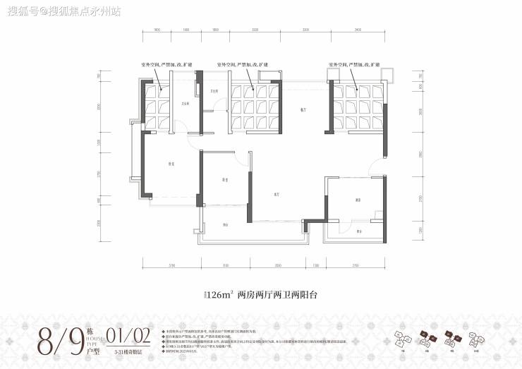 约126㎡二房两卫(8/9栋01/02户型)双龙抱珠格局,南北通透;奇数层客厅、厨房配有阳台,偶数层餐厅、主卧、厨房配有阳台,奇偶层都需要改造进门右手边、餐厅与公卫之间镂空地方,获取两个房间。