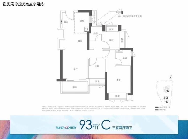 C户型约93㎡三房两卫(一单元01/04/05户型、二单元01户型)