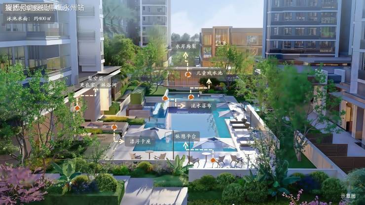 约400㎡复合泳池串联了水岸聚会廊下空间,打造游泳与家庭遛娃双核场所,在游泳的同时也能感觉惬意放松,也方便家长照护孩童并促进邻里交流。