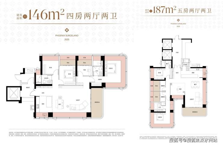 建面约187㎡五房两厅三卫:为项目的高端产品,横厅设计,面宽超7米,楼层分布:仅在13层以上,由103-111㎡户型组合而成,西南朝向,部分楼层可实现"山海入怀"的视觉冲击,得房率高达 111%(含赠送面积)