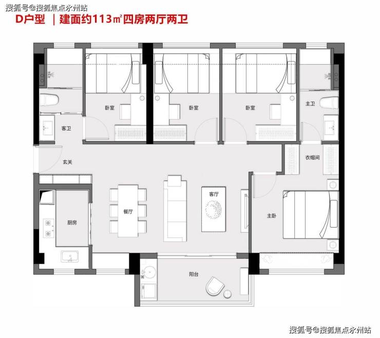 D户型|建面约113㎡四房两厅两卫:户型方正大气,宽敞横厅设计,U型奢阔厨房,轩敞主卧带独立衣帽间、卫生间,270度观景阳台,至阔南向面宽。