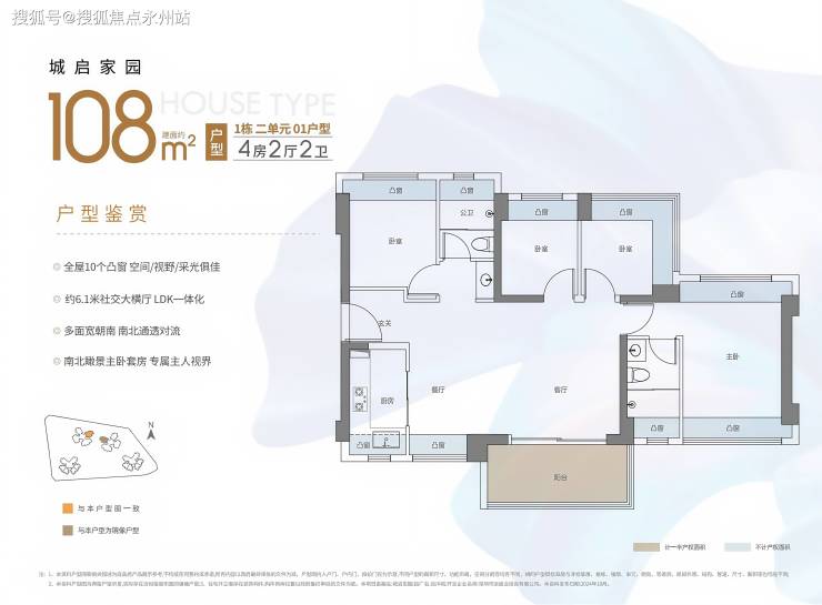 108㎡的4房2厅2卫,设计的是横厅南北通透格局,进门独立玄关,客餐厅6.4米开间,LDKB一体化,五开间朝南,主卧双飘窗通透设计,全屋10个凸窗,4个卧室分别做到了主卧17.01㎡/次卧9.7㎡/次卧8.4㎡/次卧7.35㎡(包含墙体飘窗),L型厨房,卫生间干湿分离,得房率约91.88%(包含赠送),阳台主朝西南或东南向。