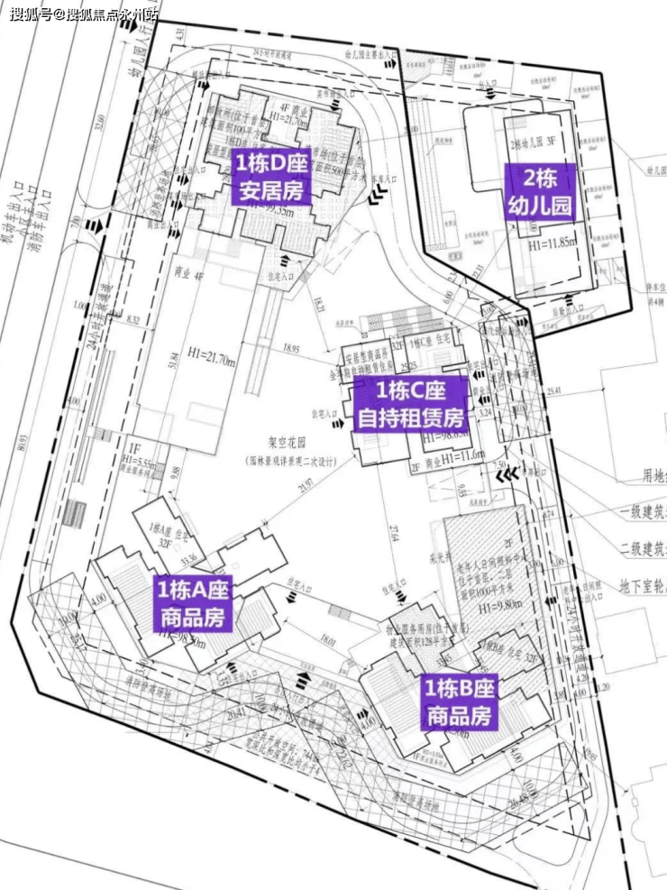 项目由6栋高层住宅围合式组成,总户数1592户,其中可售商品房约750套,安居房373套。1A(46层)、1B(46层)、1C(47层)为可售住宅,1D为安居房,1E为商寓,1F为自持物业。