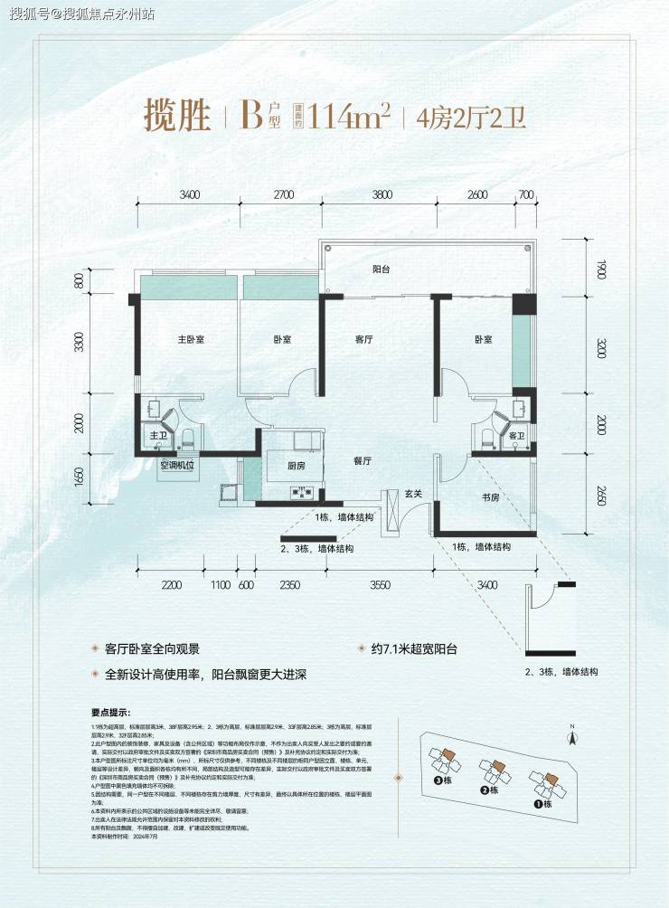 设计亮点:270° 观景 +7.1 米阳台 + 三卧室构建 13.2 米景观面。