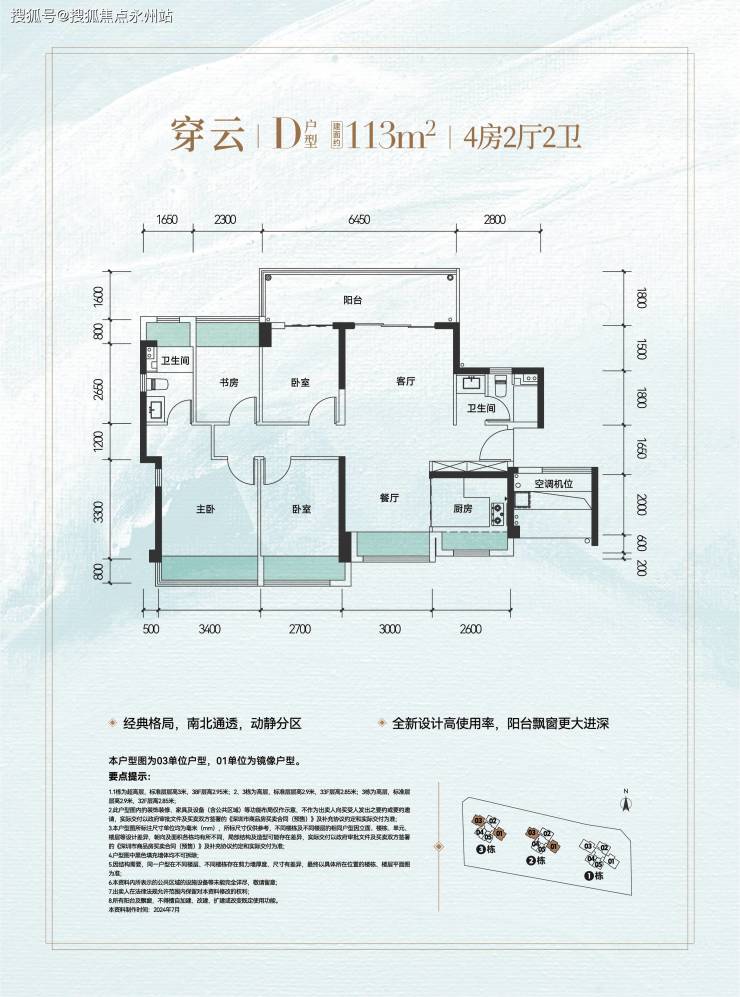 113平四房两卫,有01和03两个户型,格局一样,均为东北朝向,阳台北向看科学公园景观,两个卧室朝南。
