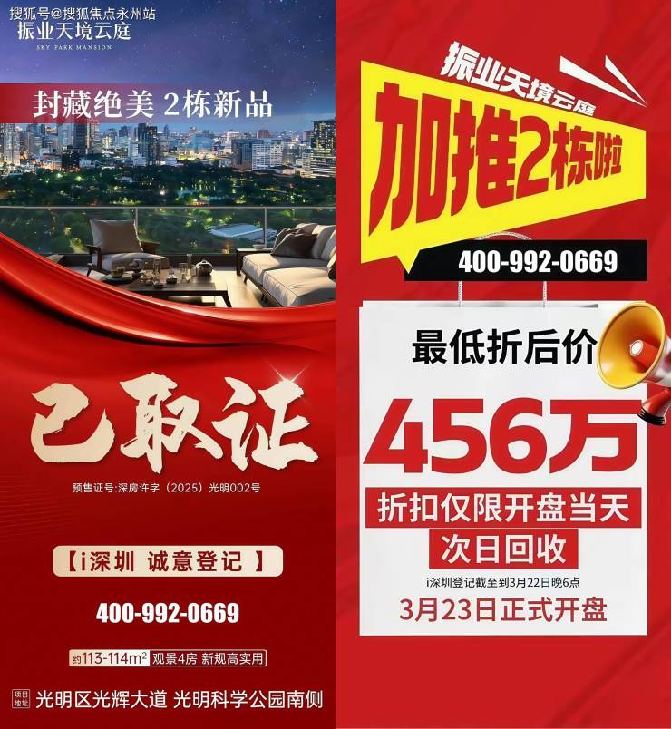 光明区超级红盘「振业天境云庭」获批预售,加推压轴93套房源,产品为建面为113-114㎡的4房。