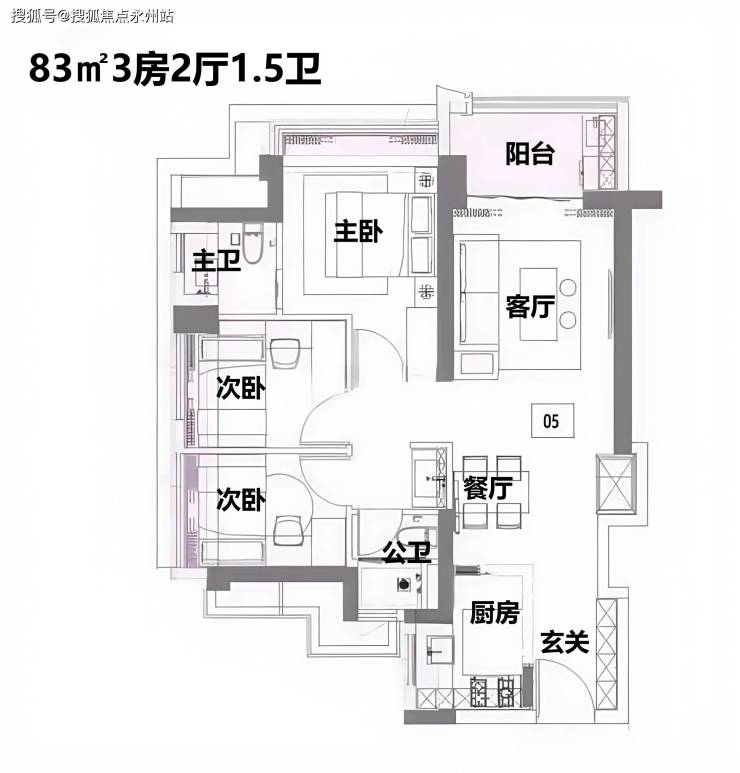 83㎡做到三房两卫,直接对标中洲迎玺三期82㎡三房两卫,